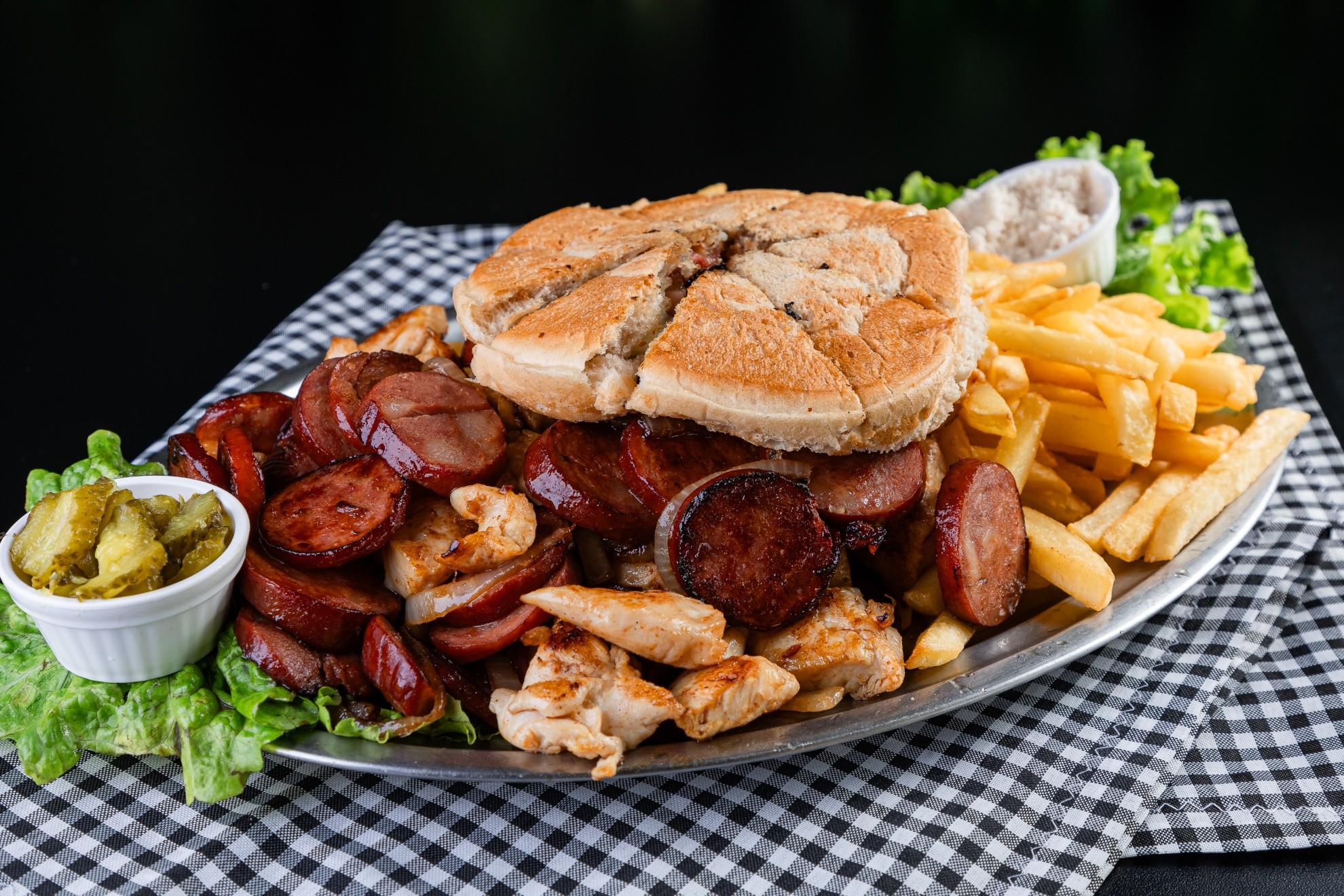 Calabresa, Frango Sassami, Fritas, Pão, Salada